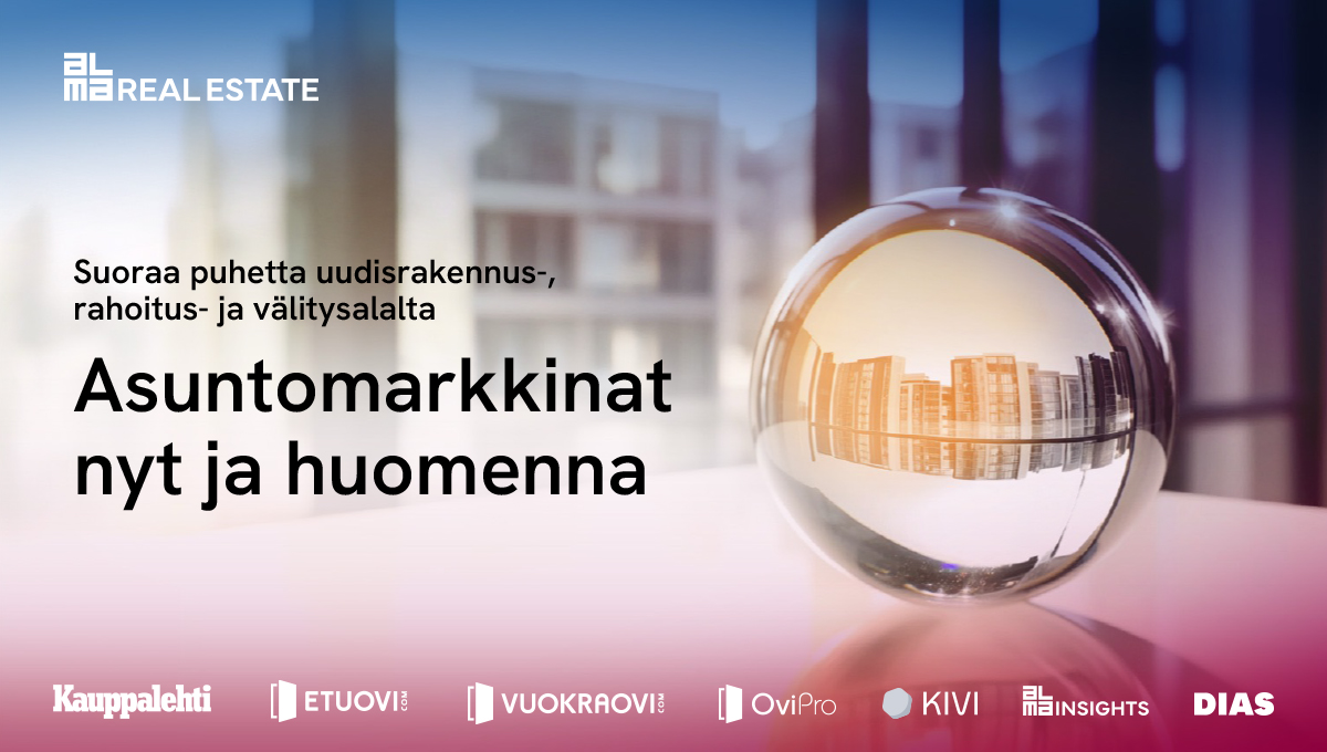 Alkusanoista vastaa Tuomo Räsänen, Alma Marketplaces Real Estate liiketoimintajohtaja ja webinaarin kulkua luotsaa Veera Tegelberg, Kauppalehden toimittaja.